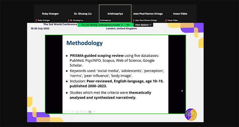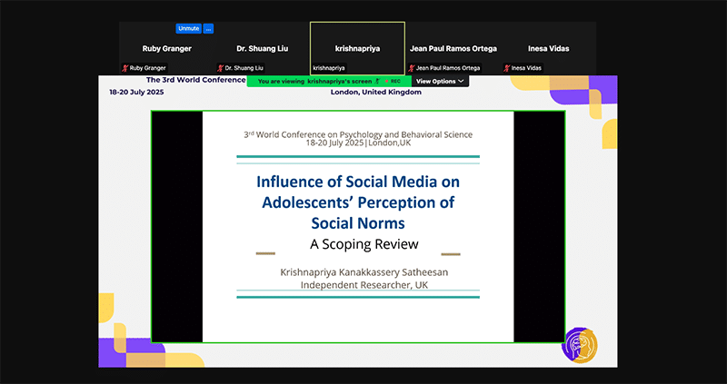 | Ms.Krishnapriya Kanakkassery Satheesan | Unaffiliated/independent researcher, UK | Influence of Social Media on Adolescents’ Perception of Social Norms: A Scoping Review |